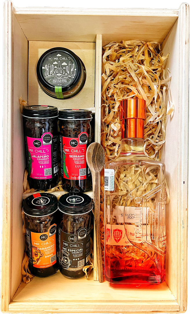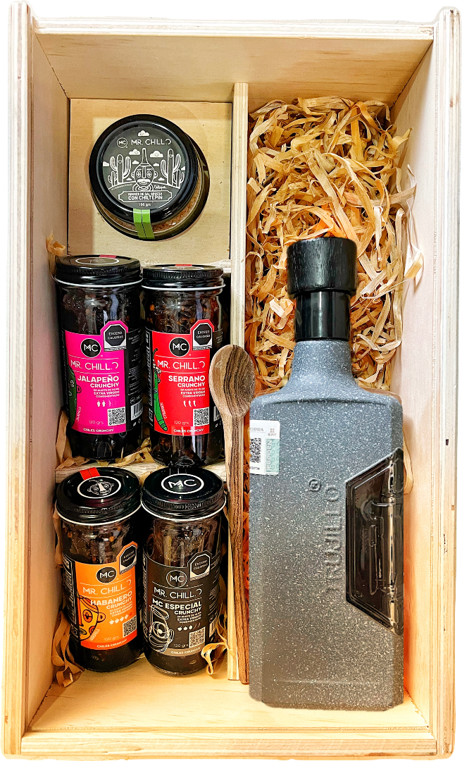 Una caja de madera artesanal, un 4 Pack de Chiles Crunchy (Jalapeño, Serrano, Habanero y Mix Especial), Chiltepunk para elevar cualquier platillo y una cuchara de Guerrero donde el 100% del costo apoya a familias artesanas.