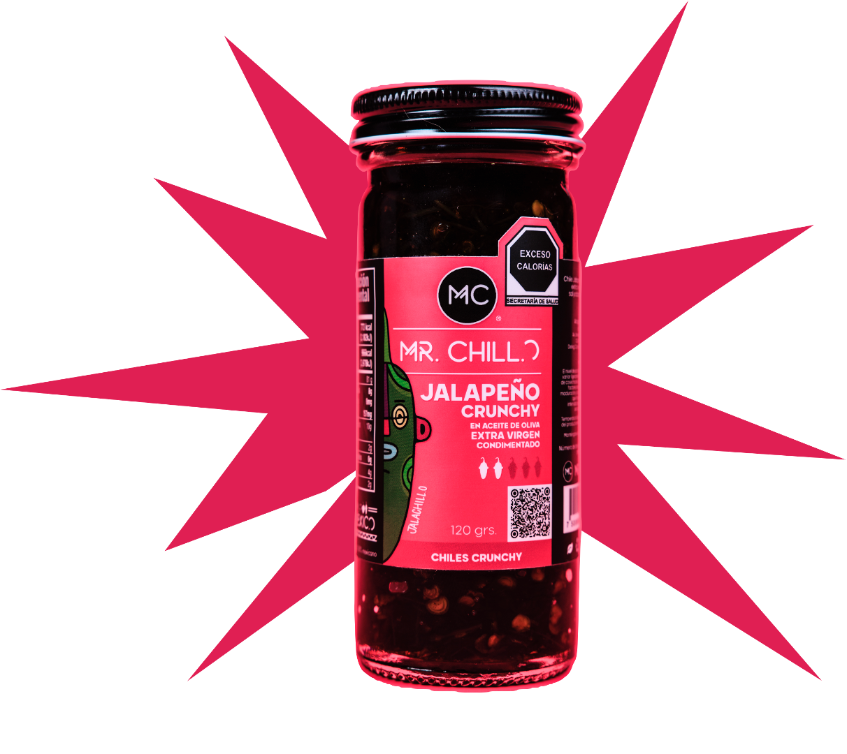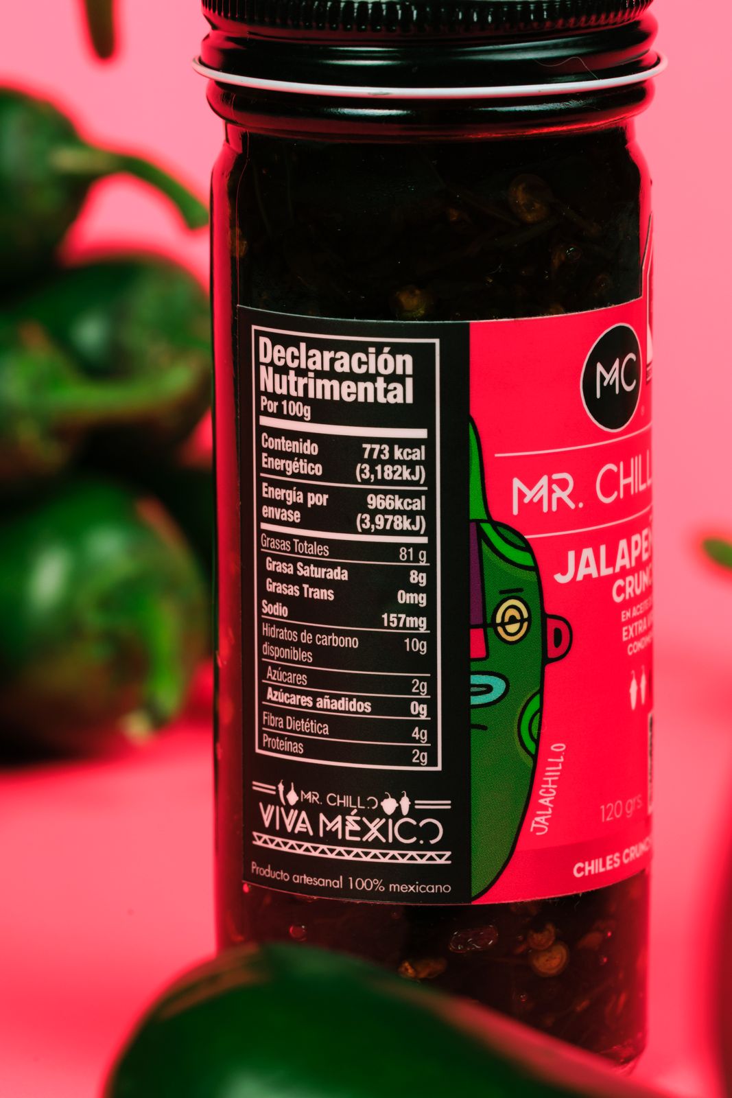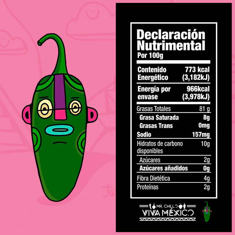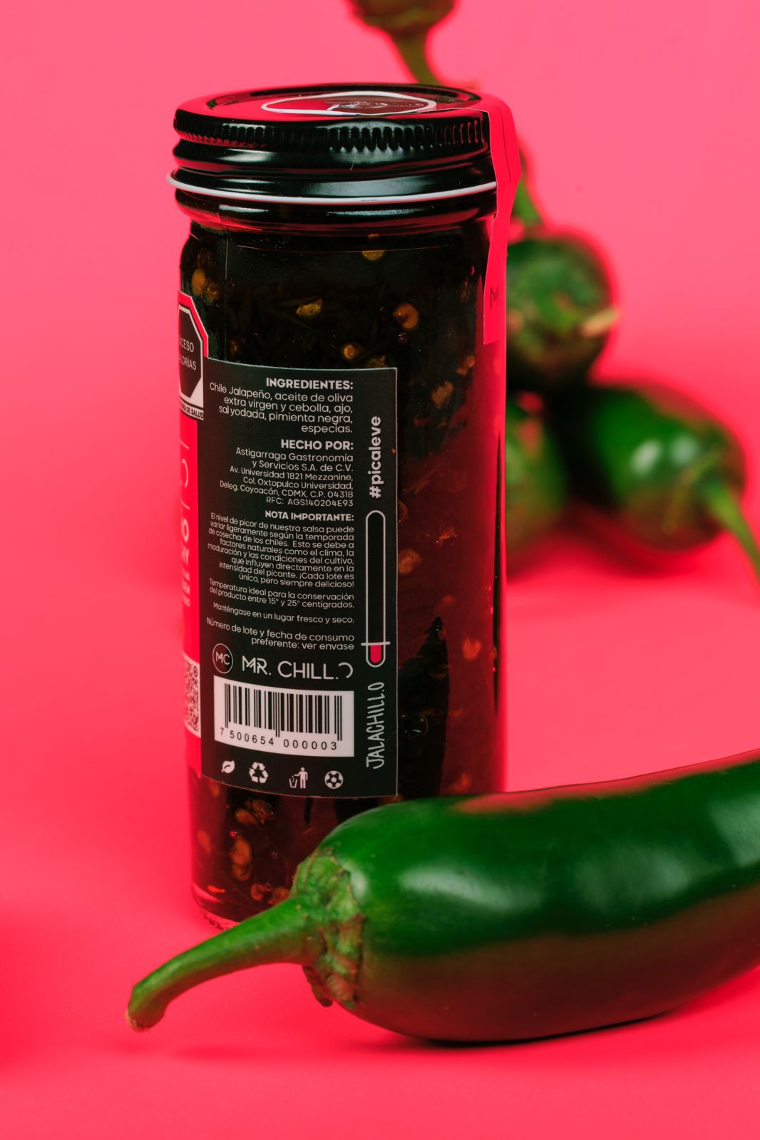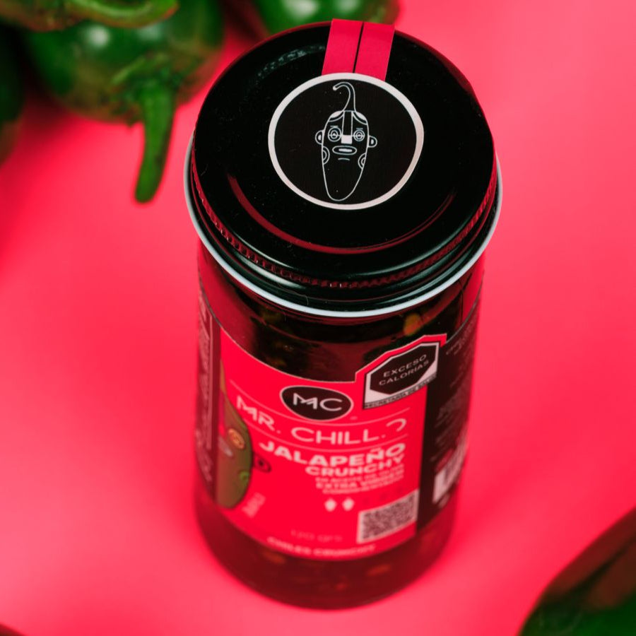 Chile Jalapeño, aceite de oliva extra virgen y cebolla, ajo, sal yodada, pimienta negra y especias.